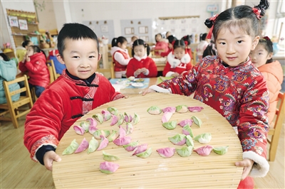 江蘇省連云港市贛榆實(shí)驗(yàn)幼兒園的老師和小朋友一起包餃子。