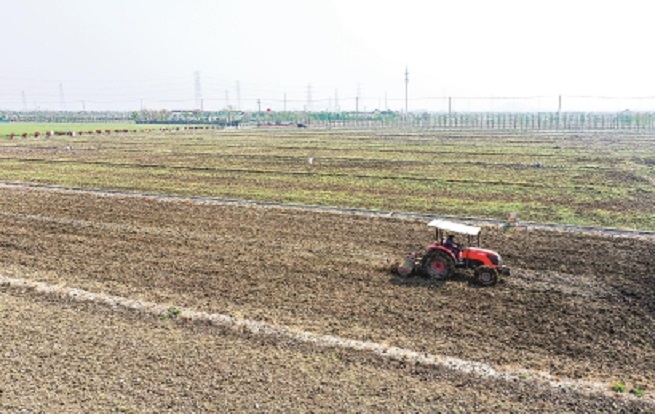 近日,拖拉機(jī)在上海松江區(qū)小昆山鎮(zhèn)萬(wàn)畝糧田現(xiàn)代農(nóng)業(yè)示范區(qū)里春耕。