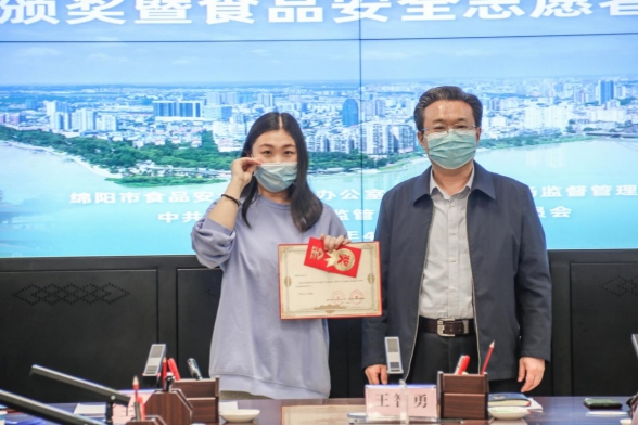 綿陽(yáng)市食安辦副主任、市市場(chǎng)監(jiān)管局副局長(zhǎng)王智勇為劉佳雯女士頒發(fā)榮譽(yù)證書以及現(xiàn)金獎(jiǎng)勵(lì)
