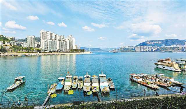 2月28日,萬州北濱大道和平廣場段,碧水藍天,一排漁船整齊停放。