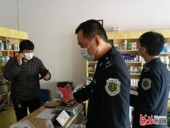 邯鄲市農(nóng)業(yè)綜合行政執(zhí)法人員對轄區(qū)內(nèi)農(nóng)資門店進行檢查。邯鄲市農(nóng)業(yè)農(nóng)村局供圖