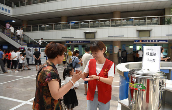 “阿姨,綠豆湯接好了,請(qǐng)您小心慢用?!?月4日上午,靈寶市第一人民醫(yī)院門診大廳,黨員志愿者蘇園把接好的“愛心綠豆湯”遞給就診患者。