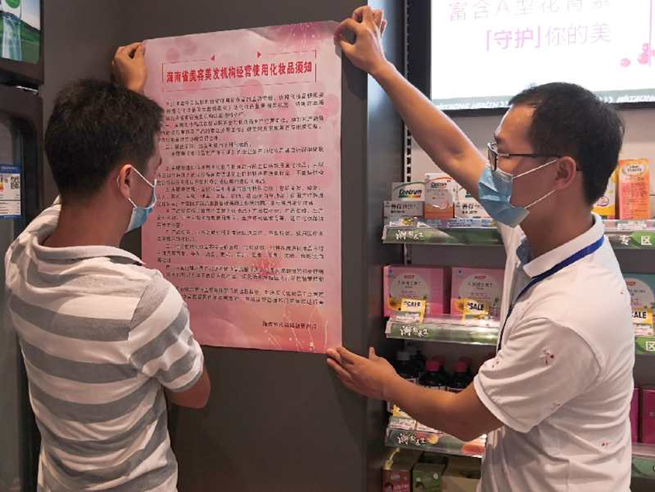 海南省藥品監(jiān)督管理局執(zhí)法人員在化妝品專賣店張貼化妝品安全科普宣傳海報(bào)