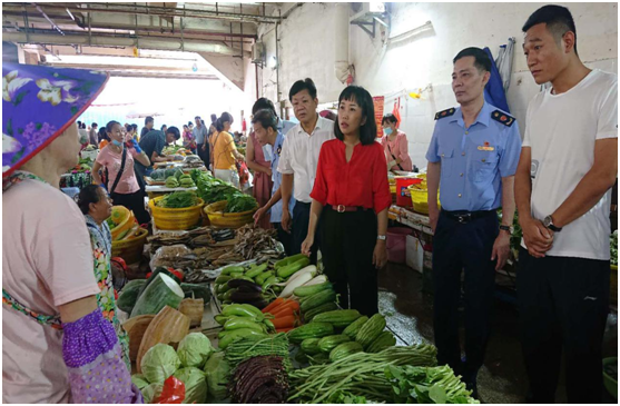 樂東縣政府副縣長卞曉燕(右三)、樂東縣市場監(jiān)管局局長王秀全(右四)了解蔬菜價格及供銷情況