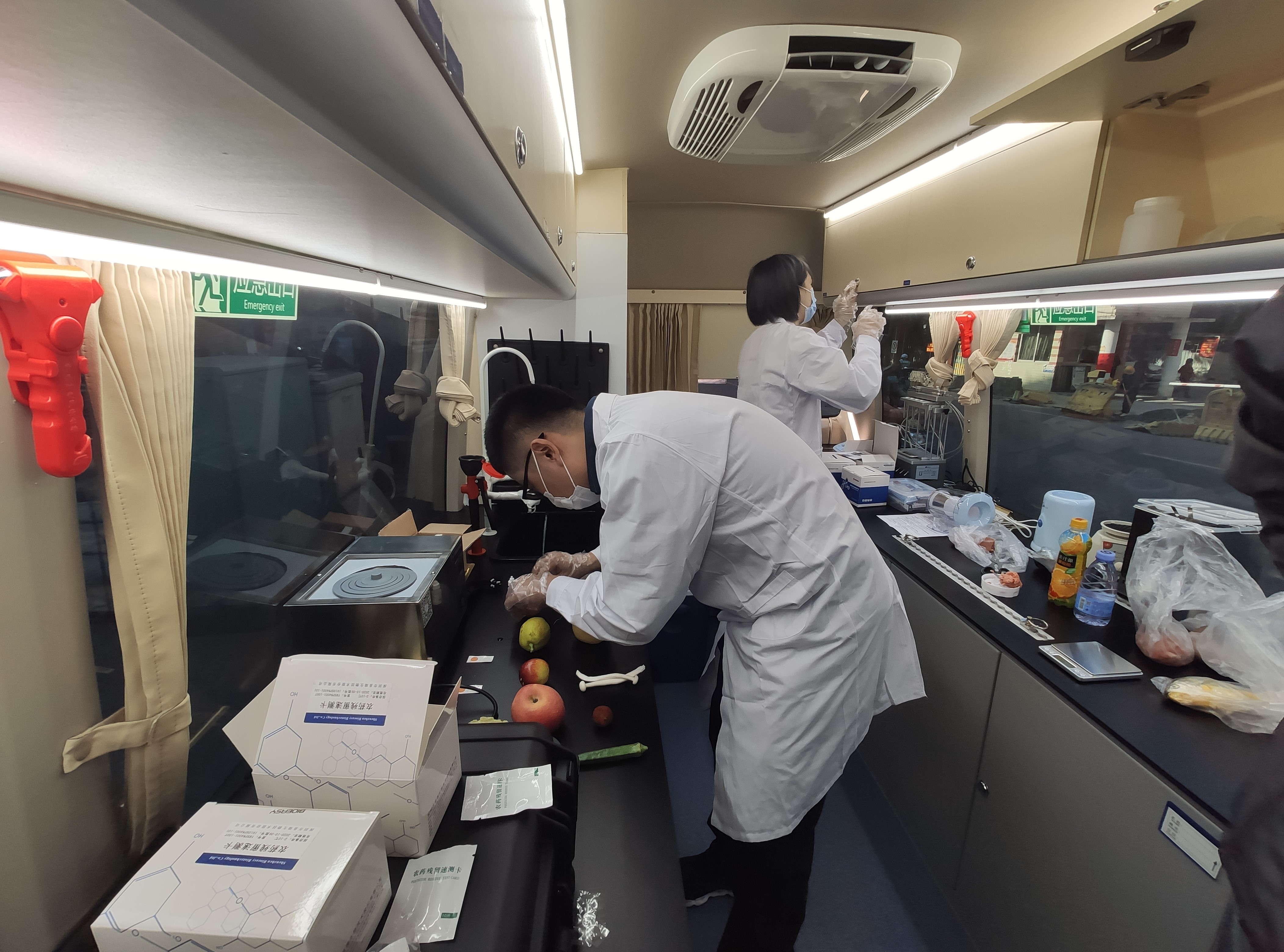 第三方檢測機(jī)構(gòu)工作人員正在食品安全快檢車上對(duì)隨機(jī)抽取的食品做快速檢測