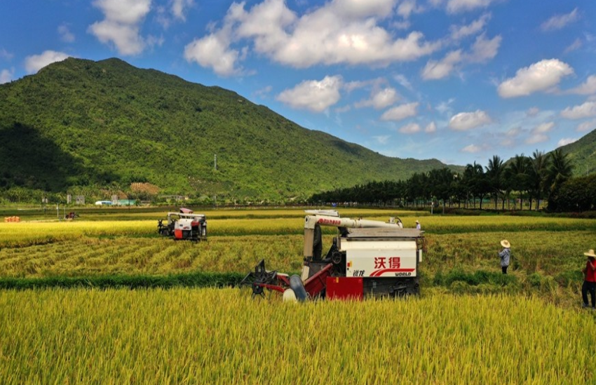 5月9日上午,湖南省雜交水稻研究中心海南省三亞市海棠灣基地,收割機(jī)對(duì)水稻試驗(yàn)示范田進(jìn)行收割測(cè)產(chǎn)。