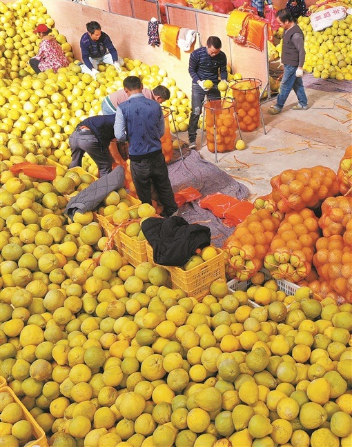 江永縣粗石江鎮(zhèn)香柚產(chǎn)業(yè)園加工車間,工人在袋裝香柚。近年來,當?shù)卮罅ε嘤浴敖老汨帧睘橹鞯奶厣a(chǎn)業(yè),種植面積達13.8萬畝,今年香柚產(chǎn)量預計可達10萬噸以上,村民通過發(fā)展香柚產(chǎn)業(yè)實現(xiàn)增收致富。(蔣克青?田如瑞)
