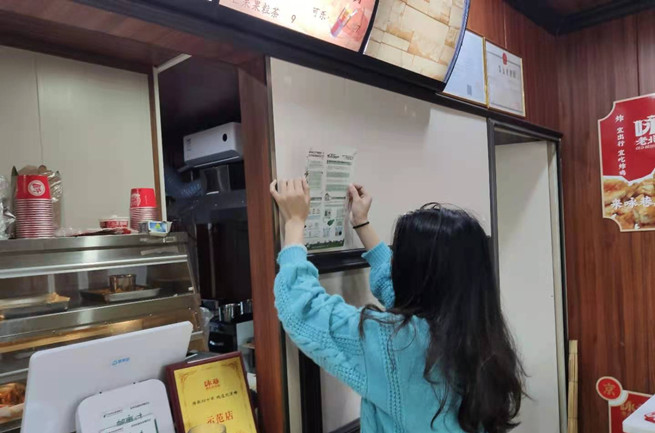 執(zhí)法人員在餐飲店粘貼禁塑海報(bào)